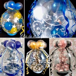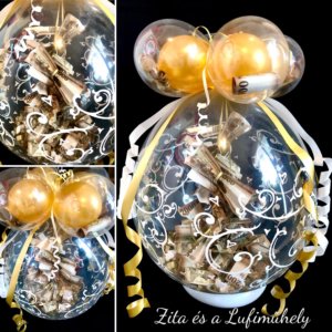 Igen, kedvencem az ajándék csomagolása lufiba 😀 , ezt írtam már bemutatkozáskor is: az első komolyabb beruházásom egy töltőgép volt, melynek segítségével bármit lufiba tudok csomagolni, ami átfér 12cm átmérőn. Cipőt, mackót, párnát, ékszert, fotót, pénzt is akár. Lufiba lehet lufit is tölteni: halmozzuk az élvezetet, a bent ficánkoló kis lufikba pedig rejthetünk konfettit, cukorkát, felgöngyölt papírpénzt is. Apropó bankjegyek:), rendkívül mutatós és cseppet sem unalmas íly módon csomagoltatni őket. Ezek a kompozíciók levegővel készülnek, tehát nem lebegnek, de a pénztekercseket lehet héliumos lufiba is tölteni. Mennyivel büszkébben adjuk át így ajándékunkat, igaz? Látványos, szép a csomagolás és mókás, hogy picit meg kell dolgozni a meglepetésért: persze a lufidurrantás örömteli feladat. 😀